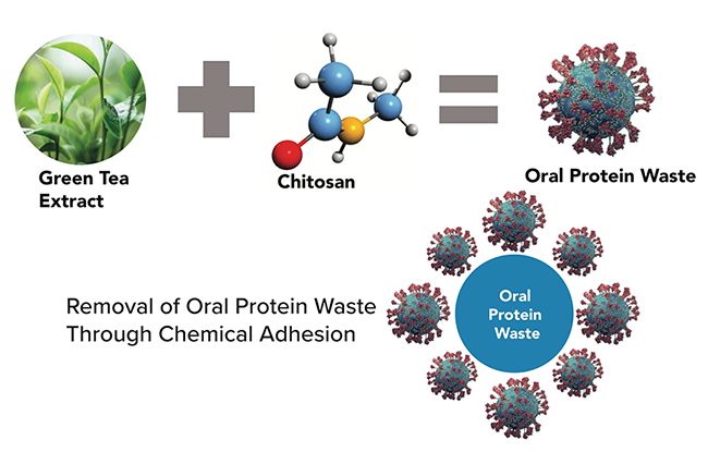 Substance combined with chitosan and green tea extract adhere to and remove leftover protein foods between teeth.
